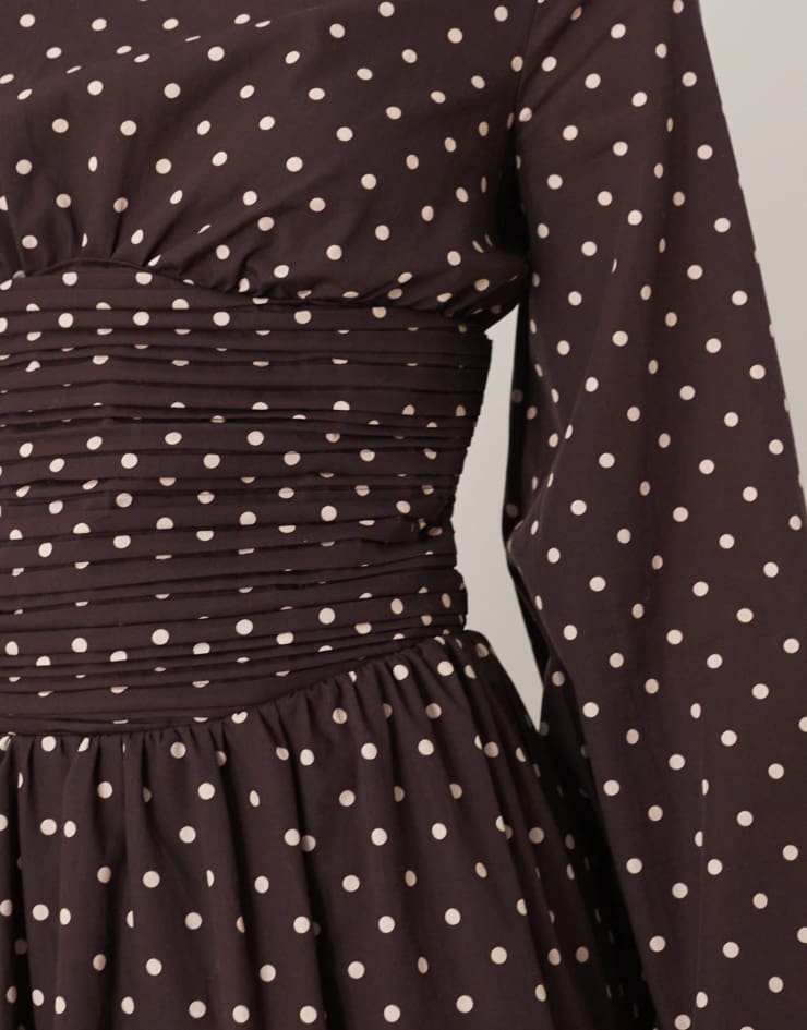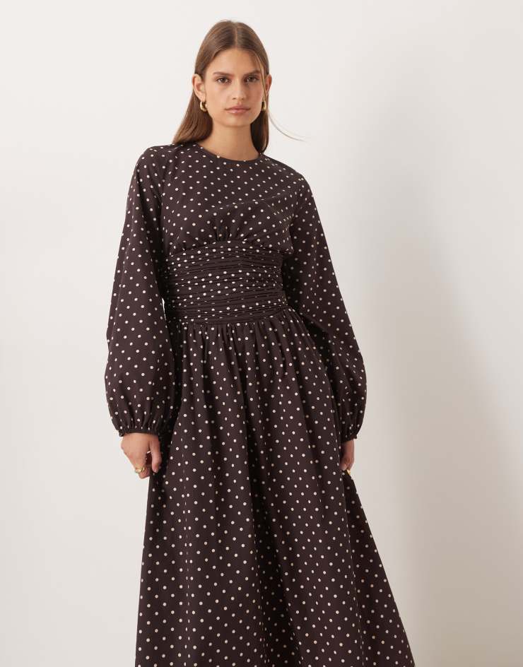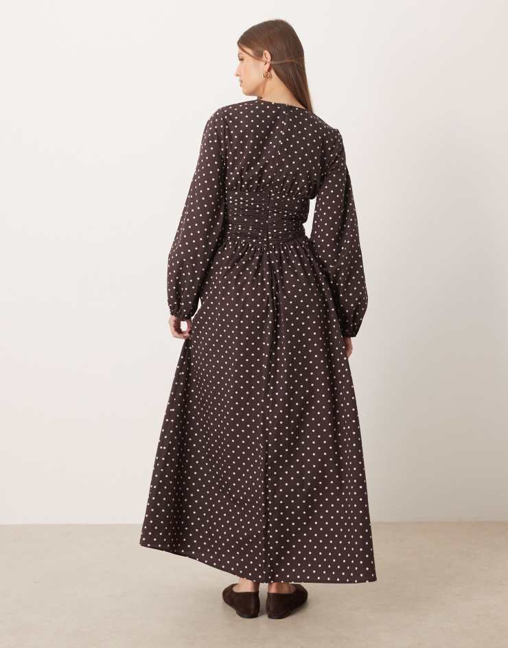 ASOS DESIGN poplin crew neck maxi dress with ruched waist and volume sleeve in chocolate micro spot