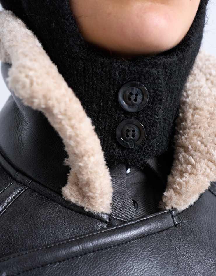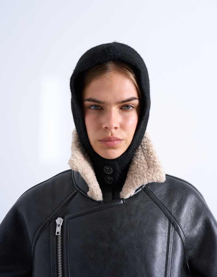 The Hayley hood is crafted using a fluffy knit in a black shade. Featuring a fixed hood and button details, it is a winter wardrobe staple.