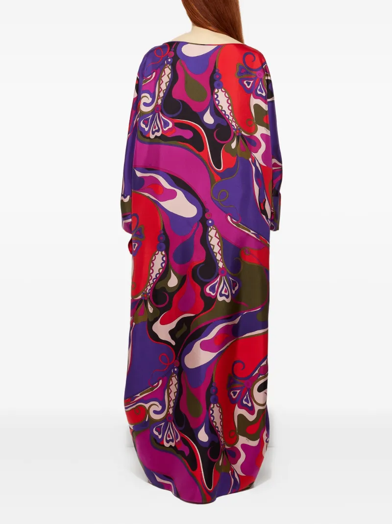 Purple/multicolour silk Orchidee print long sleeves floor-length