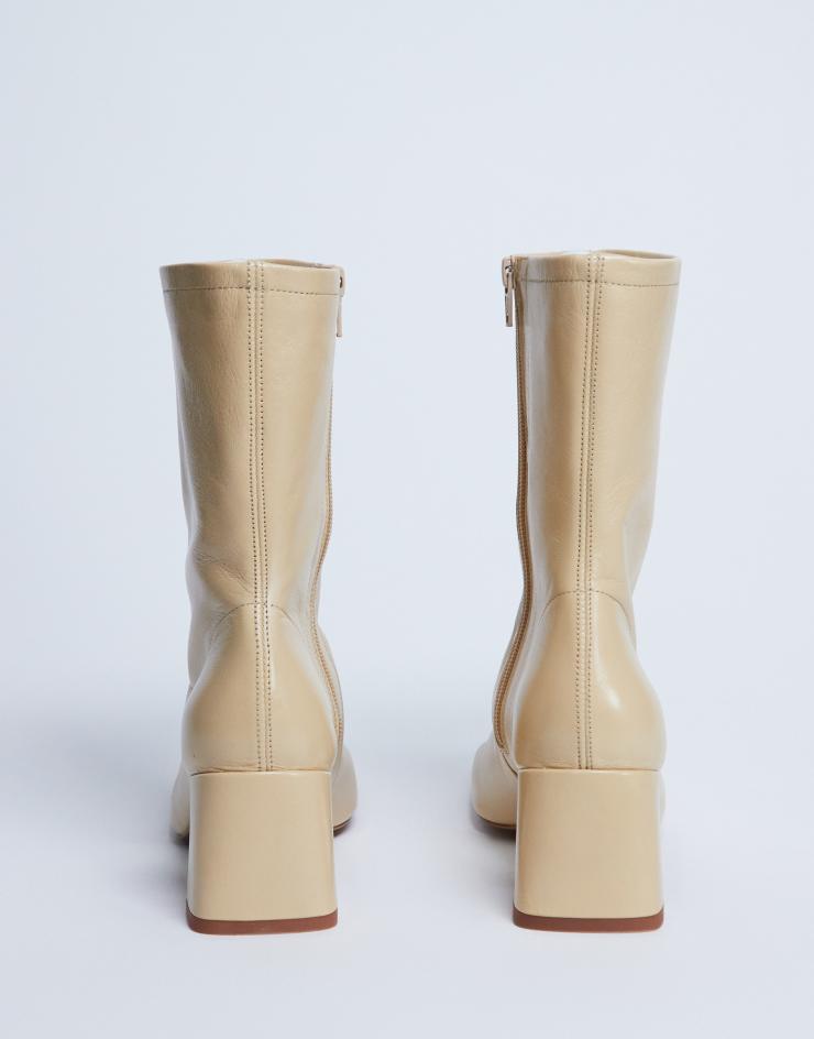 These boots are crafted from a plain, matte fabric. They feature an ankle-length cut, zip fastening, square toe and a flared heel.