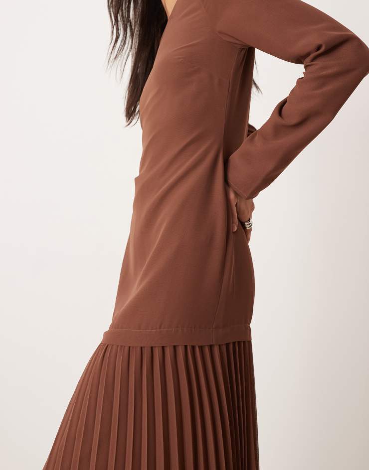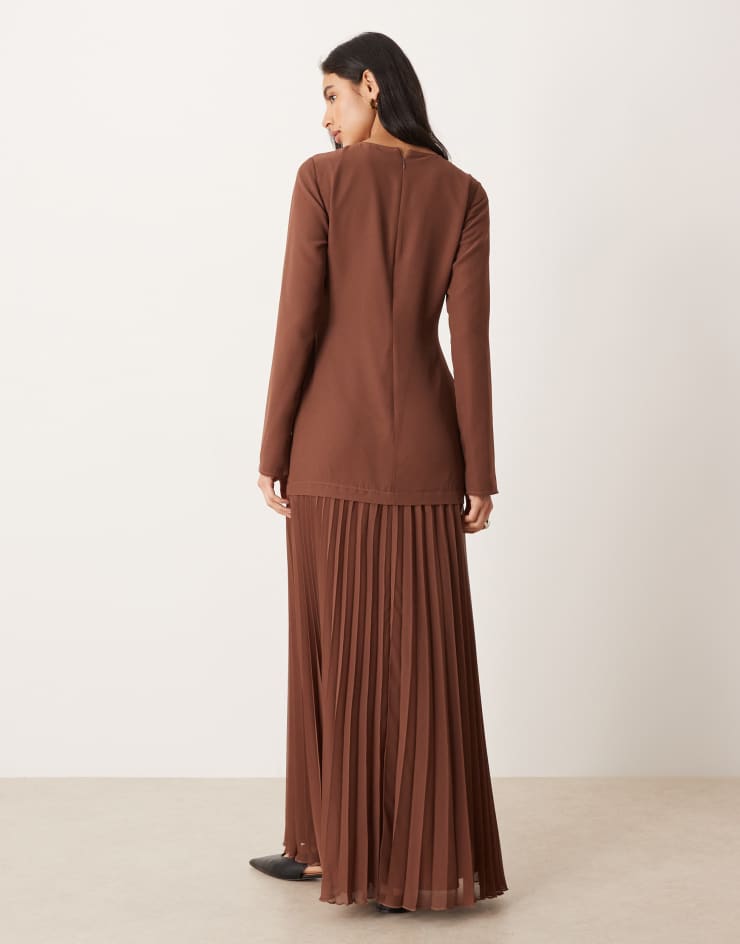 ASOS DESIGN long sleeved pleated skirt maxi dress in chocolate