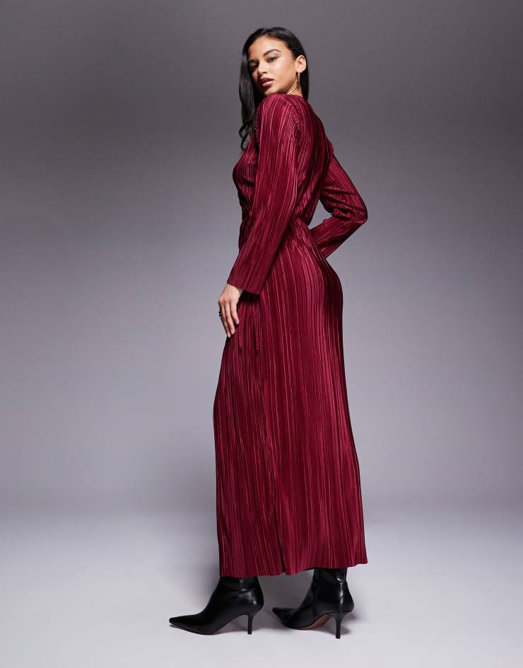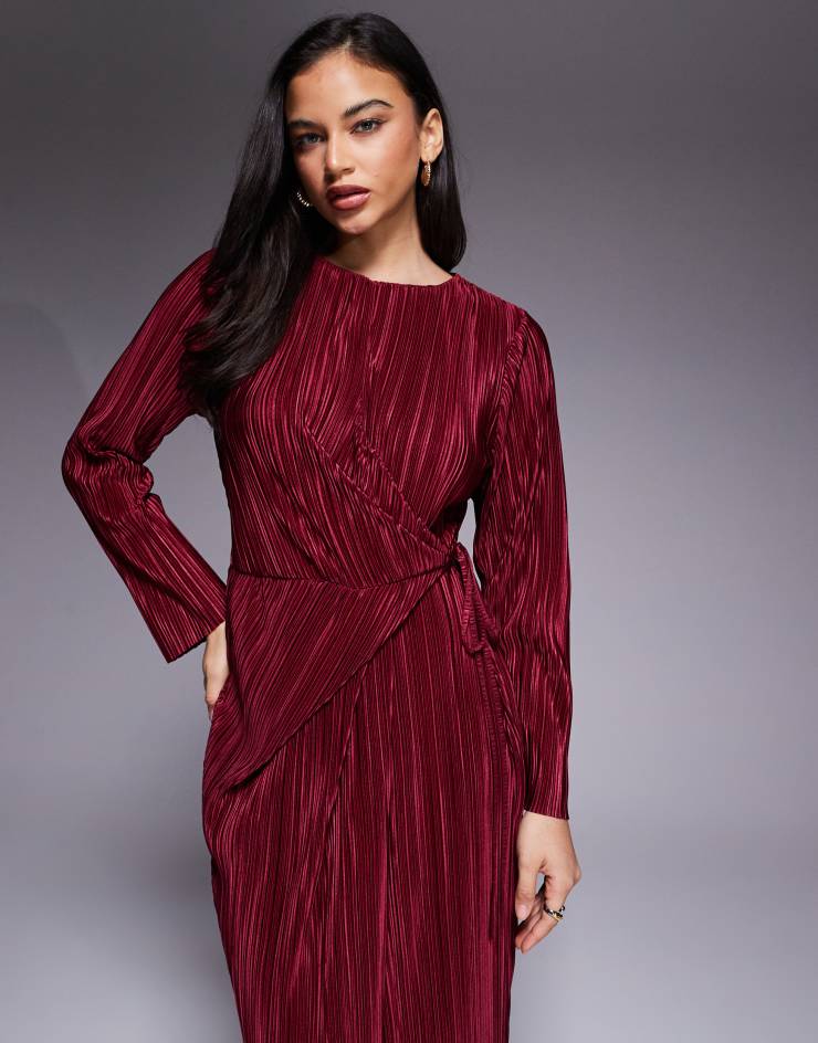 ASOS DESIGN plissé long sleeve wrap tie waist maxi dress in wine